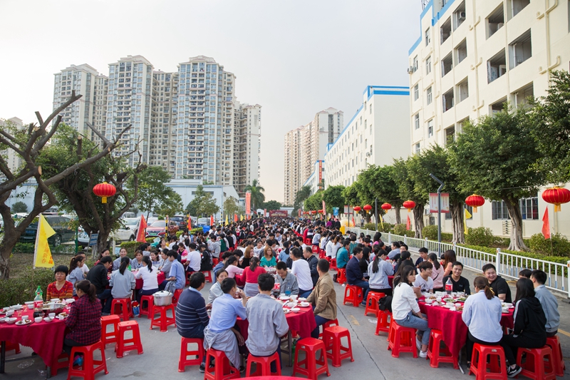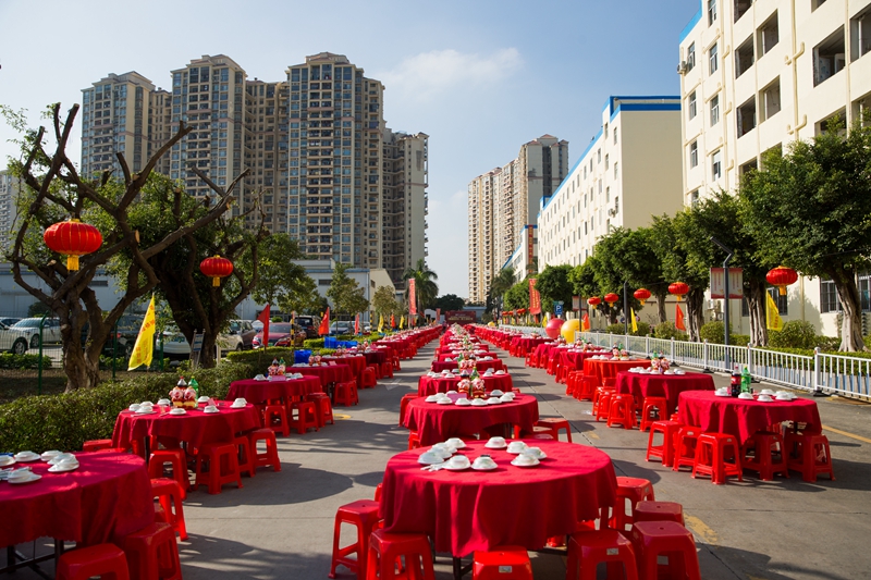 2019年1月11日下午,鳥語(yǔ)花香、陽(yáng)光明媚。京華智能產(chǎn)業(yè)科枝園區(qū)彩旗獵獵,燈籠高掛,處處張燈結(jié)彩,一副熱鬧非凡、美輪美奐的景象。遠(yuǎn)遠(yuǎn)望去,京華大道上綿延幾百米,整齊地排列著160張鋪著大紅臺(tái)布的餐桌,猶如幾條巨大無(wú)比的彩帶在京華科技園區(qū)飛舞,場(chǎng)面頗為壯觀。