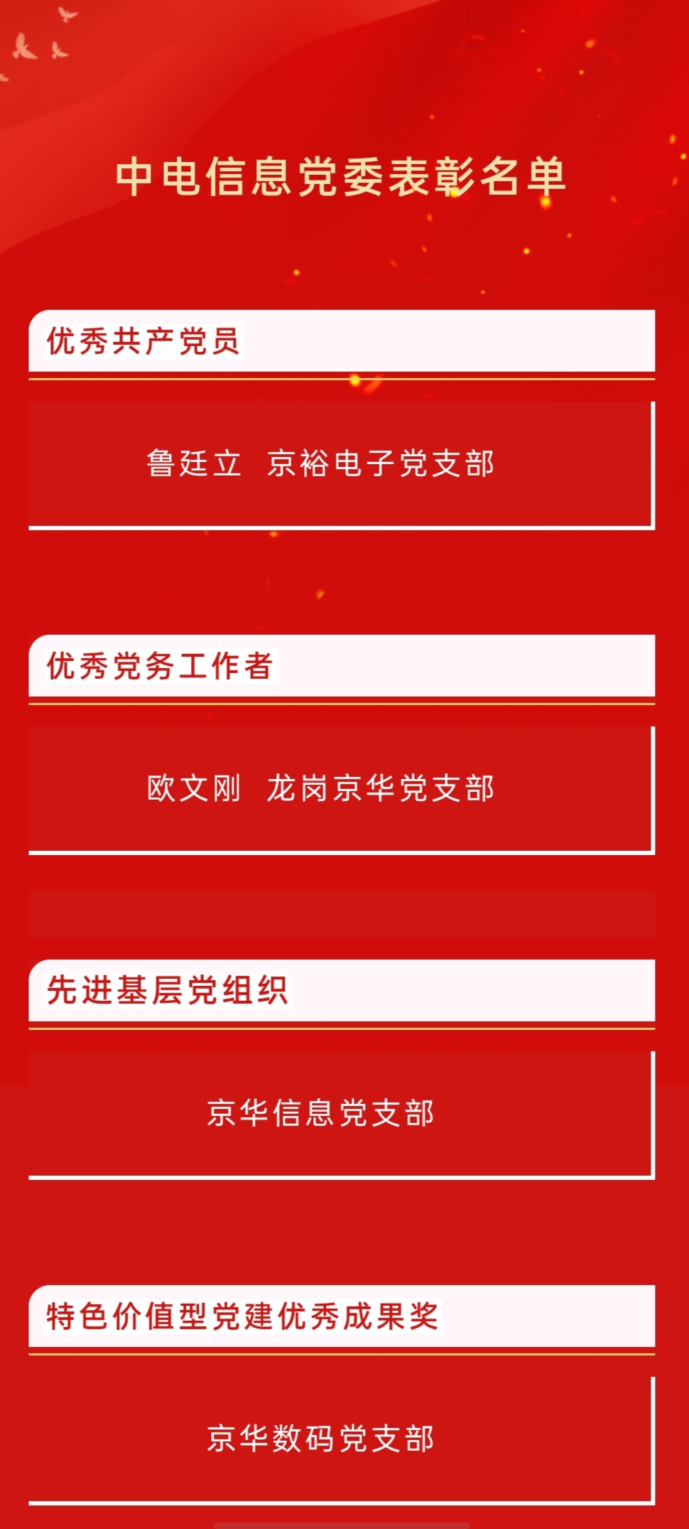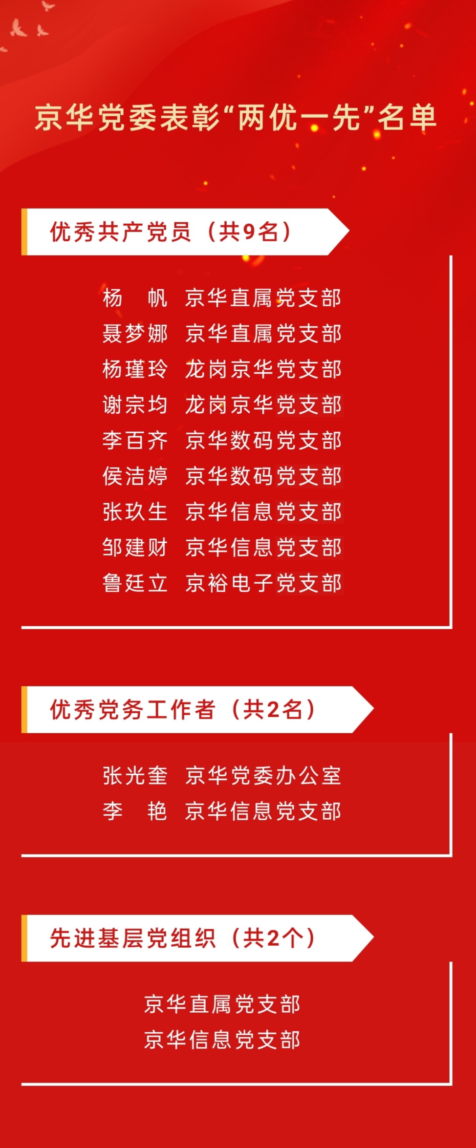 黨委委員、總會計師邢洋宣讀《京華公司關于表彰“兩優一先”的決定》,與會領導為獲獎代表頒發榮譽證書并合影留念。公司黨委號召全體黨員干部向受表彰的先進集體和個人學習,堅定理想信念,敢于擔當、積極作為,為 “十四五”開新局、起好步,貢獻智慧和力量!