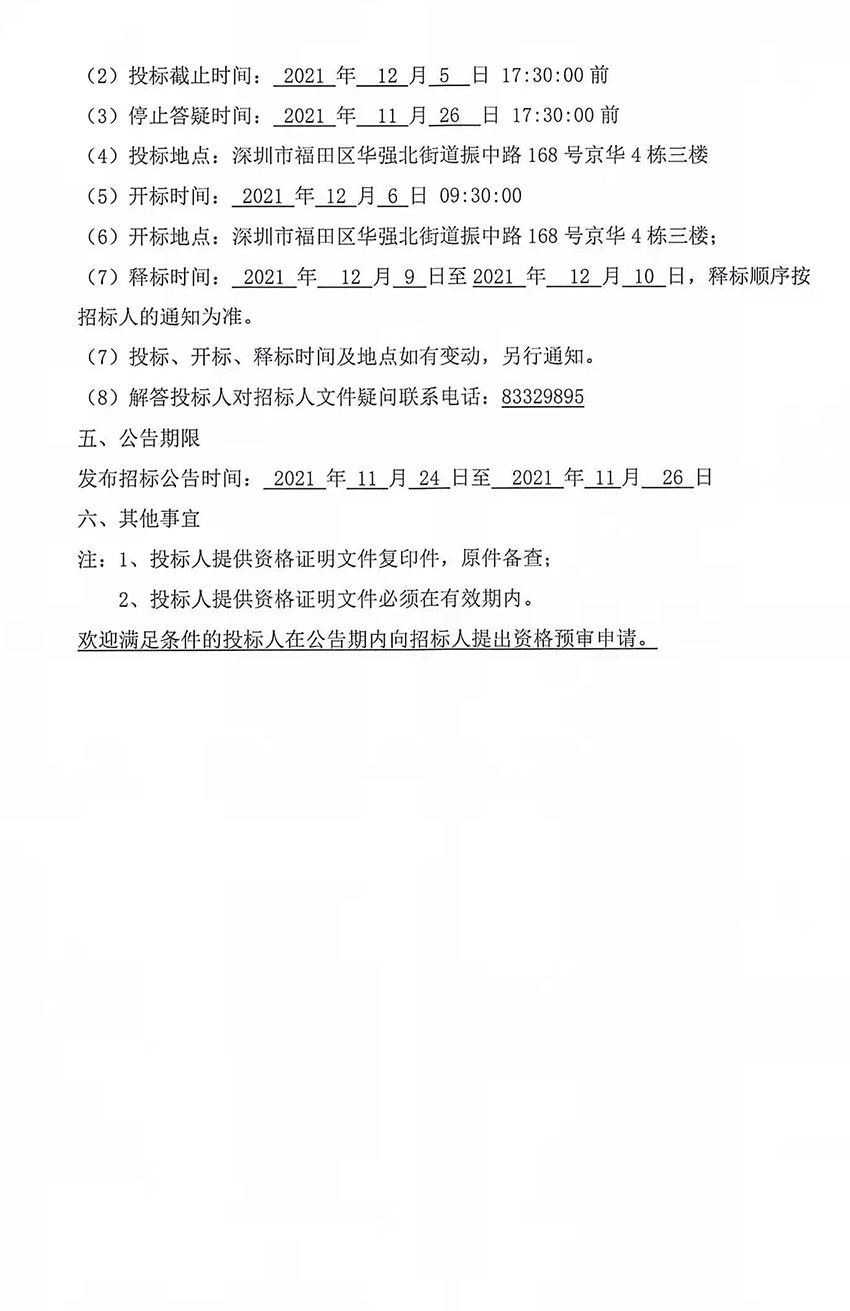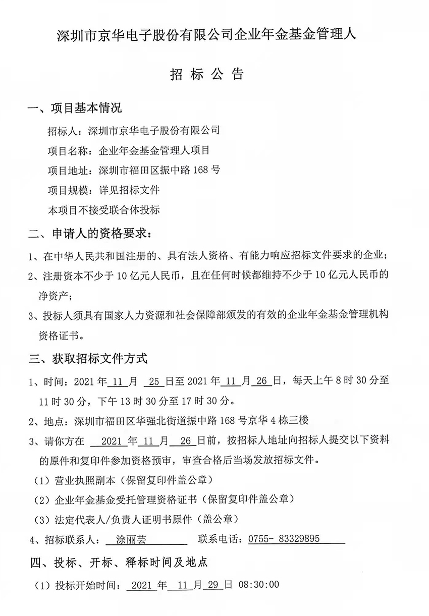 深圳市京華電子股份有限公司企業年金基金管理人招標公告