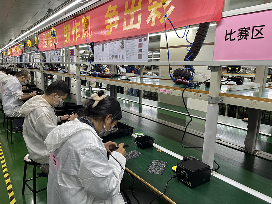 “螺絲不能歪斜”“焊點的外觀要光滑、圓潤、清潔、均勻”“氣泡直徑不能超過3mm”…… 驟降的氣溫抵擋不住選手們的參賽熱情,在京華電子智能產業科技園的生產車間賽場上,裁判員們正在認真地著每一個細節。58名技能參賽選手就數碼貼膜技術、焊接技術和智能裝配技術3個項目展開激烈角逐。